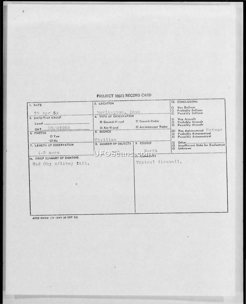 Project 10073 Record Card — Burlington, Iowa, 29 April 1958