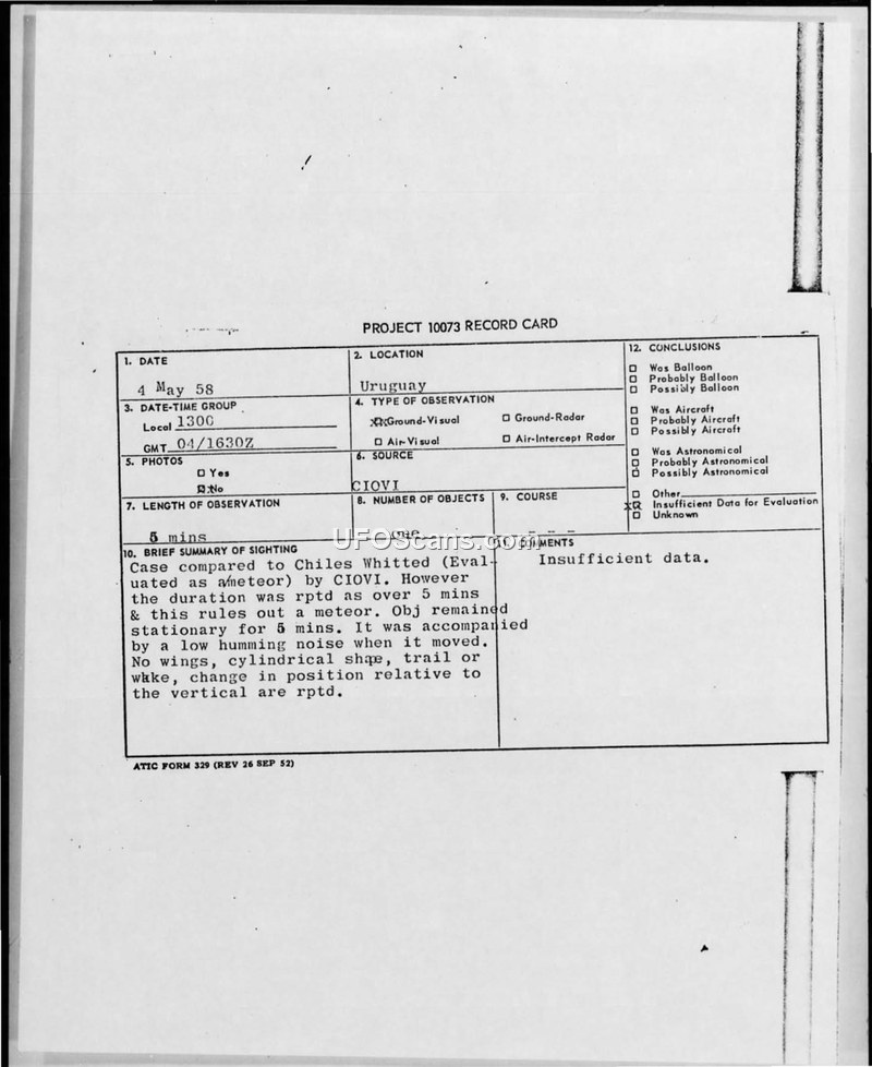 This document collection contains investigation records from the Uruguayan Centro de Investigaciones de Objetos Voladores Inidentificados (CIOVI) regarding two UAP sightings in May 1958. The first incident occurred on May 4, 1958, near Sarandí del Yi, involving a cylindrical object observed by Carlos Alejo Rodríguez. The witness reported the object remained stationary for approximately five minutes, emitting a low humming noise, and lacked wings or a wake. The second incident occurred on May 25, 1958, near Punta de Abrojal, involving a spherical object observed by Colonia R. Rius, who described it as metallic and aluminum-colored, noting sudden acceleration and oscillation. CIOVI investigators analyzed these reports, noting that the descriptions were consistent with the 'flying cigar' type of unidentified object. The reports emphasize the observers' credibility and the absence of contradictions in their accounts. To provide context, the investigators included a historical reference to a June 24, 1948, encounter between an Eastern Airlines DC-3 and a large, wingless object resembling a B-29 fuselage, which reportedly maneuvered violently near the aircraft. The CIOVI reports conclude that while the 1958 sightings exhibit characteristics commonly associated with 'flying saucers'—such as specific shapes, sudden acceleration, and oscillation—the cases are officially classified as having 'insufficient data' for a definitive conclusion, partly due to the lack of personal interviews and physical evidence. The documents include standardized observation forms, maps, and narrative summaries in both Spanish and English, reflecting the systematic approach taken by the Uruguayan intelligence and research units to document these phenomena during the second trimester of 1958.