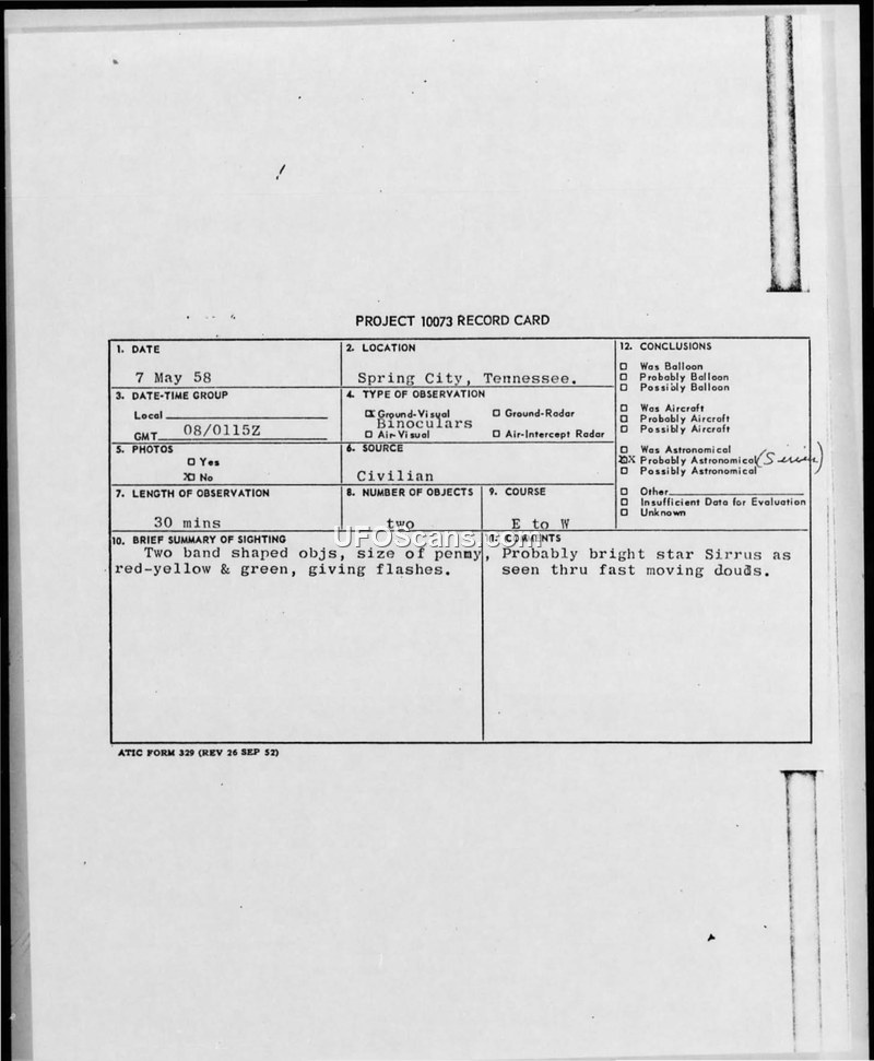 A 1958 sighting report from Tennessee describes two flashing objects observed through binoculars. The investigation concluded the objects were likely the star Sirius viewed through moving clouds.