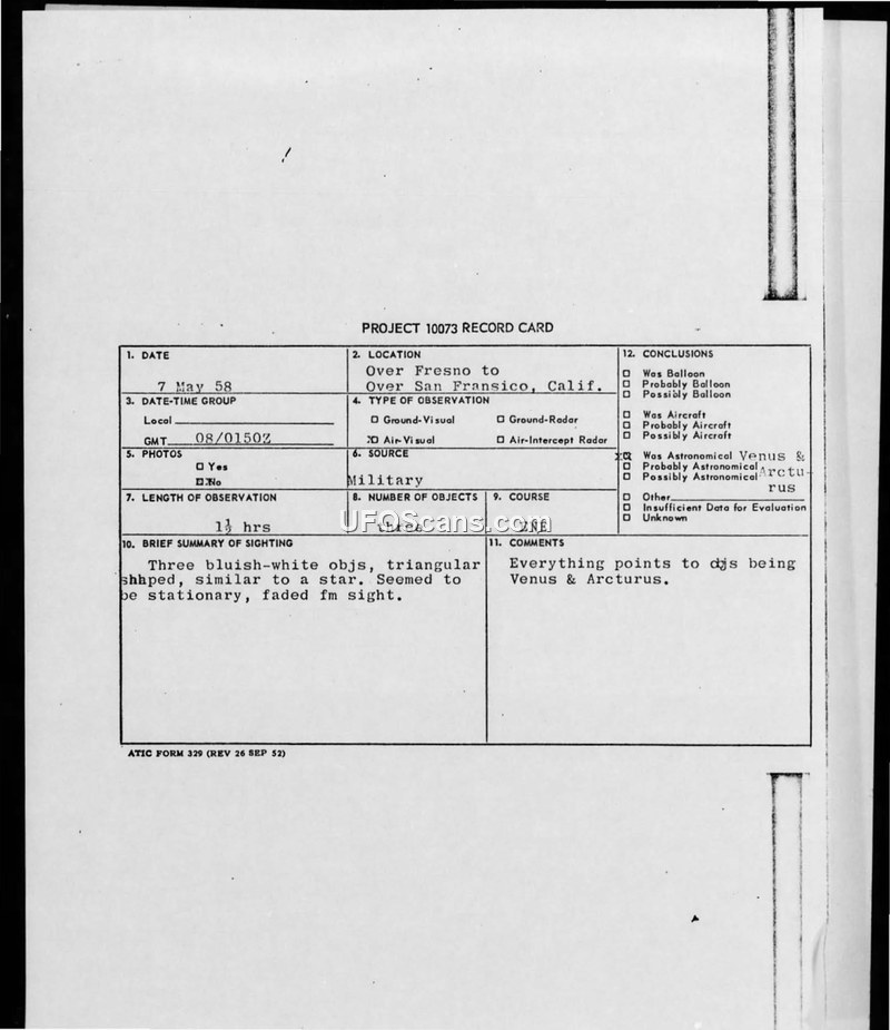 This document consists of a Project 10073 record card and associated military communications regarding a sighting of three unidentified objects on May 7, 1958. The objects were observed by a pilot, 1/LT E.R. Fender, and other commercial airliners in the area, including TWA Flight 215, while traveling from Fresno to San Francisco, California. The witnesses described the objects as bluish-white, triangular in shape, and similar to stars. The objects appeared to remain stationary for approximately one hour and thirty minutes before fading from sight. The military report notes that the objects were observed in the vicinity of the stars Venus and Arcturus. Despite the initial report, the official conclusion reached by the Air Technical Intelligence Center was that the objects were indeed the stars Venus and Arcturus. The investigating officer included a comment acknowledging the difficulty in believing that professional pilots would mistake these celestial bodies for UFOs, yet noted that such illusory effects are known to occur during dawn or dusk observations.