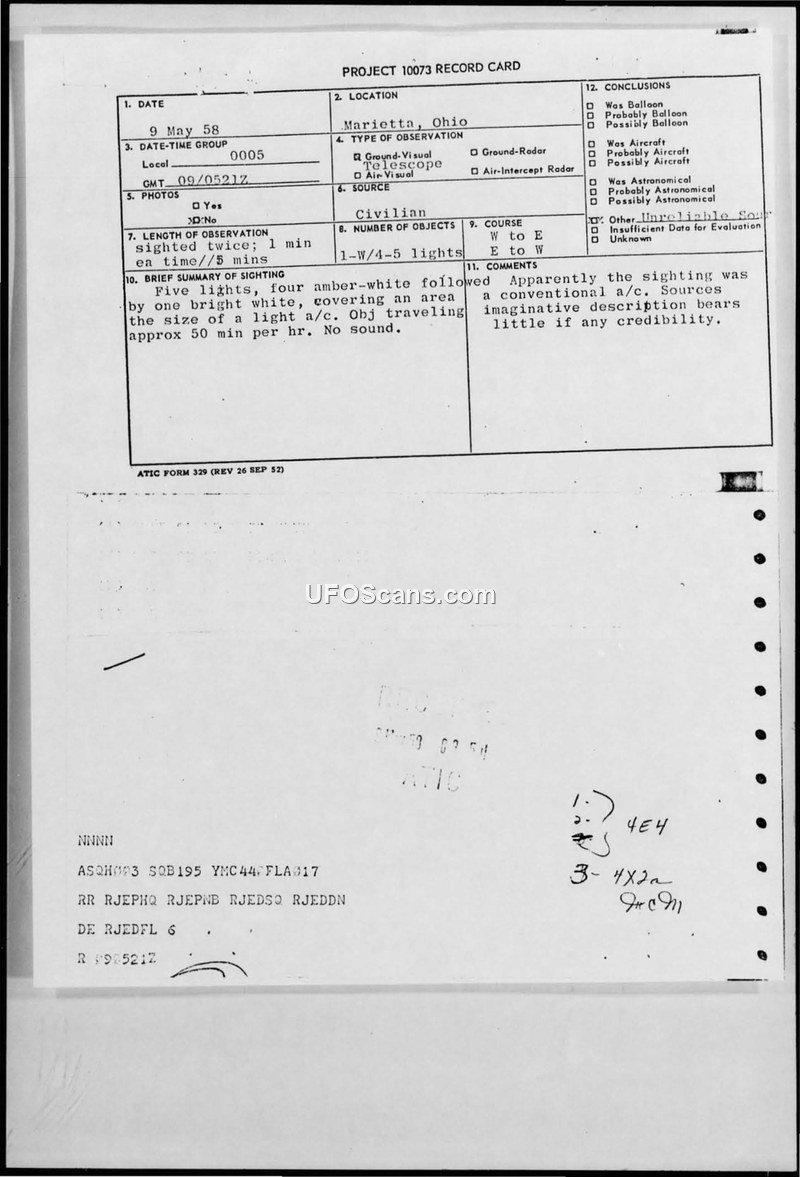 Project 10073 Record Card and Air Intelligence Information Report — Marietta, Ohio, 9 May 1958