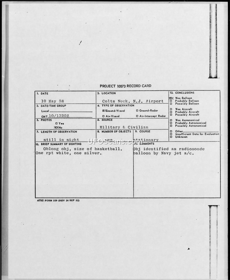 A sighting of an oblong object near Colts Neck, New Jersey, on May 10, 1958, was officially identified by a Navy jet pilot as a radiosonde balloon.