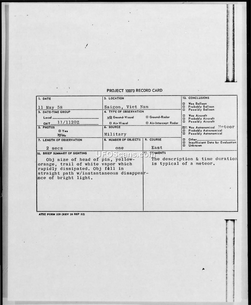 On May 11, 1958, at 1120Z, a sighting of an unidentified aerial phenomenon was reported in Saigon, Viet Nam. The observation was made by Sergeant Donal I. Rondeau of the U.S. Marine Corps and Captain Wilford L. Harris of the U.S. Air Force, both stationed at the American Embassy in Saigon. The witnesses described the object as having the appearance of a 'head of pin' with a yellow-orange color and a trail of white vapor that dissipated rapidly. The object was observed for approximately two seconds, moving in a straight path before disappearing instantaneously with a bright light. The weather conditions at the time were reported as clear with unlimited visibility. The report was filed under Project 10073 and followed the reporting format specified in AFR 202-2. The official evaluation by the Air Technical Intelligence Center (ATIC) concluded that the description and duration of the sighting were typical of a meteor. The report also contained a query regarding the possibility of the object being a Russian satellite, though the final assessment remained consistent with a meteor identification.