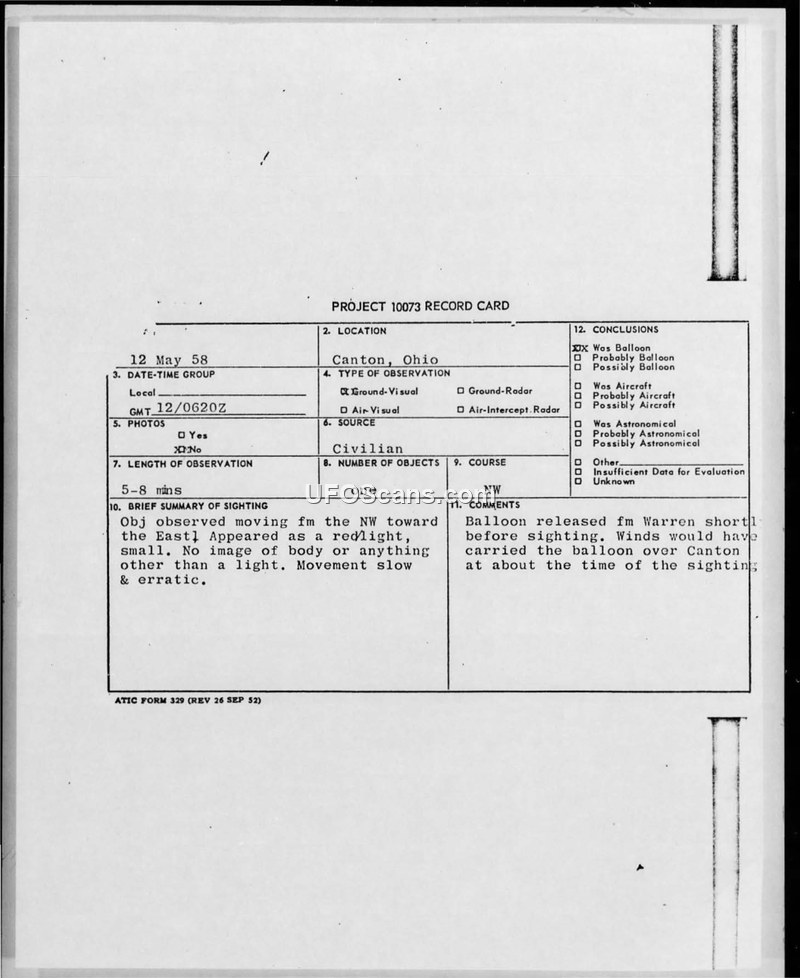 This document contains a collection of records, correspondence, and internal routing slips related to two separate UFO sightings reported by a civilian in Canton, Ohio, in May 1958. The primary witness, a night watchman, submitted detailed accounts of his observations to the Air Force. The first incident, occurring on May 12, 1958, involved a slow-moving, erratic red light observed for 5 to 8 minutes. The Air Force investigation concluded that this object was a weather balloon launched from Warren, Ohio, noting that prevailing winds at the time would have carried such a balloon directly over the witness's location in Canton. The second incident, reported on May 20, 1958, involved a cigar-shaped object with streamers, observed for approximately 3 seconds. This event was officially classified as a meteor sighting. The documentation includes the witness's original correspondence, where he mentions his interest in the subject sparked by Donald Keyhoe's book, 'Flying Saucers From Outer Space.' Military officials, specifically Major Lawrence J. Tacker, handled the reports and emphasized the importance of directing such information to the Air Force rather than civilian ufologists. The file also contains internal military communications, including a memo routing slip and a formal letter from the Base Provost Marshal at Wright-Patterson Air Force Base, confirming that the reports were forwarded to the Air Technical Intelligence Center (ATIC) for evaluation. The records provide a clear view of the military's administrative process for handling civilian UFO reports during the late 1950s, focusing on identifying conventional explanations such as weather balloons and astronomical phenomena.