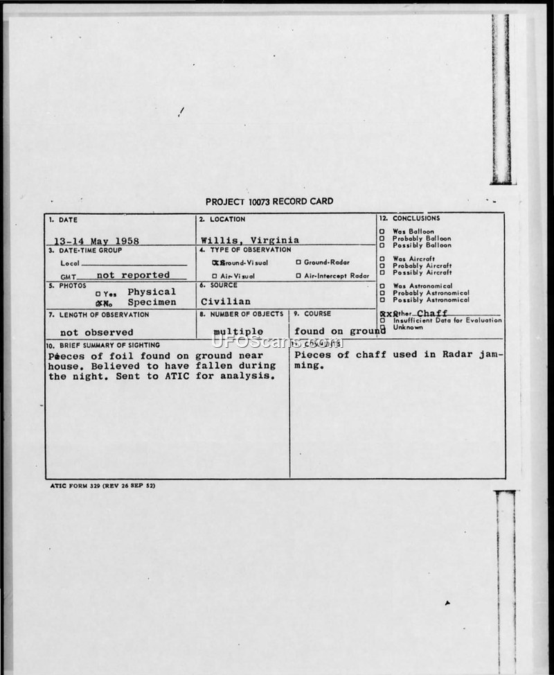 A civilian reported finding mysterious foil strips near their home in Virginia in May 1958. The Air Force identified the material as radar chaff used in military training exercises.