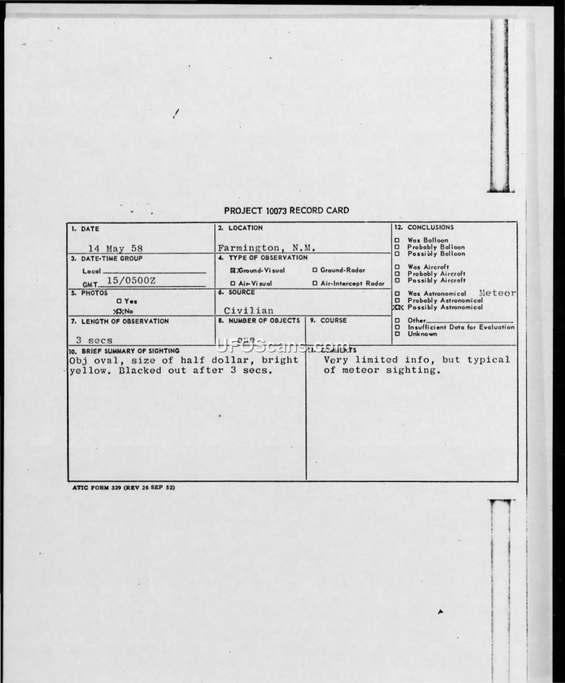Project 10073 Record Card: Farmington, N.M. Sighting, 14 May 58