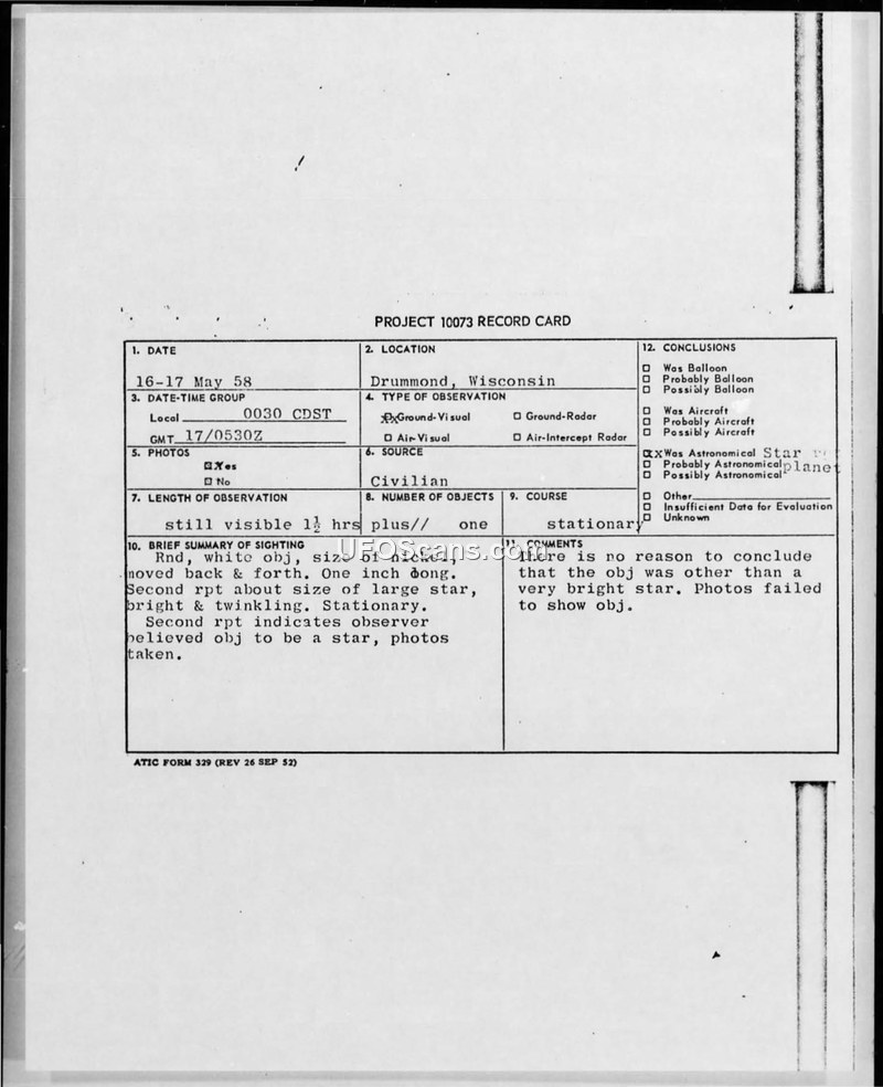 Project 10073 Record Card: Drummond, Wisconsin Sighting, 16-17 May 1958
