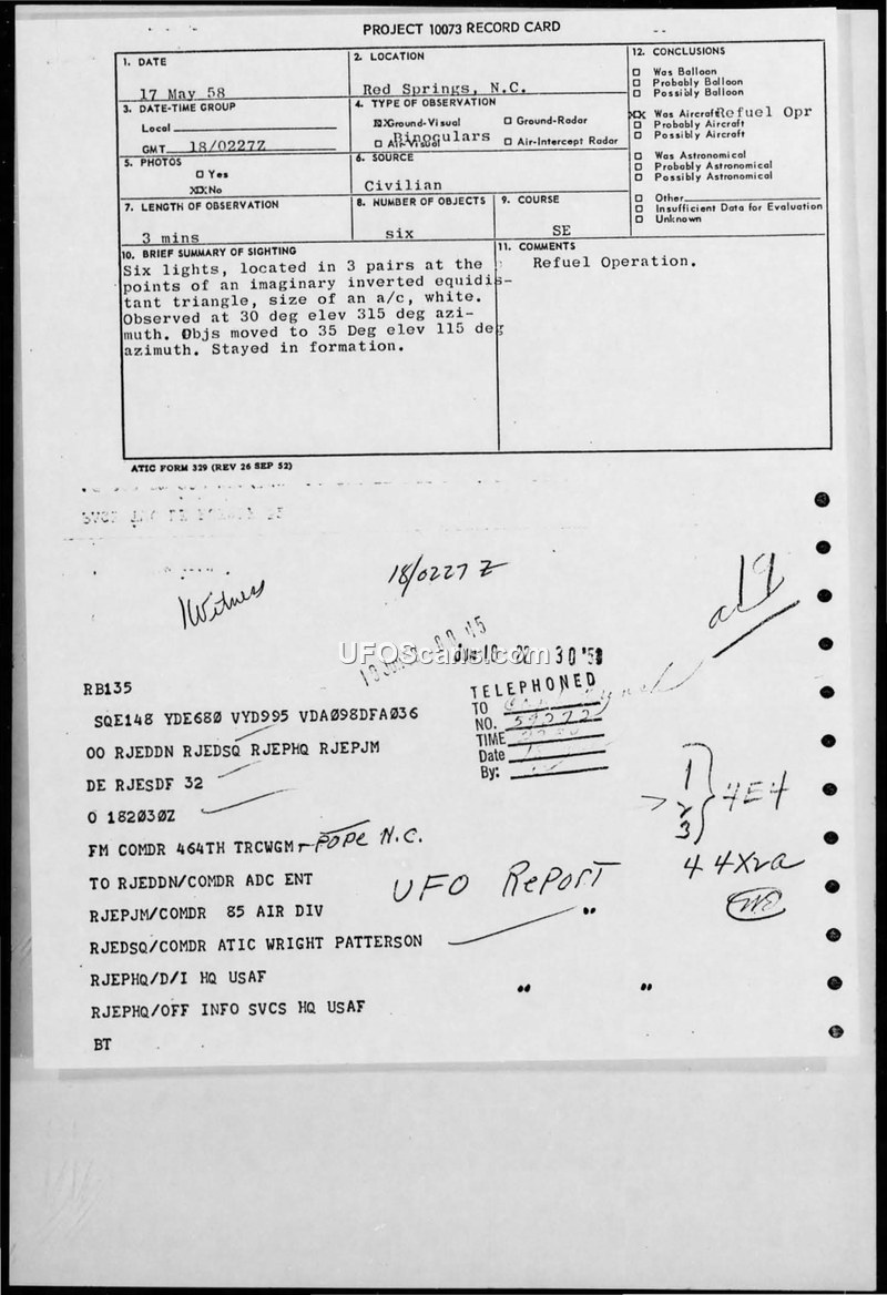 A civilian reported six lights in formation over Red Springs, NC, in May 1958. Military investigation linked the timeframe to a refueling mission, where a pilot reported natural atmospheric phenomena, including static electricity and the Aurora Borealis.