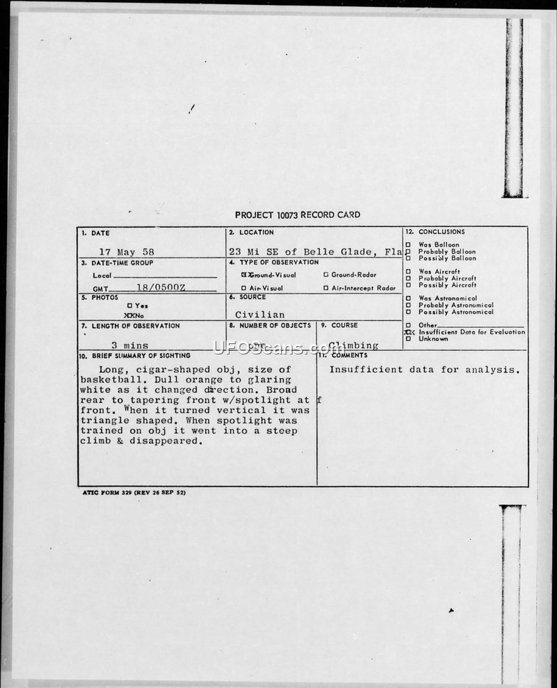 Project 10073 Record Card — 17 May 1958 Sighting, Belle Glade, Florida