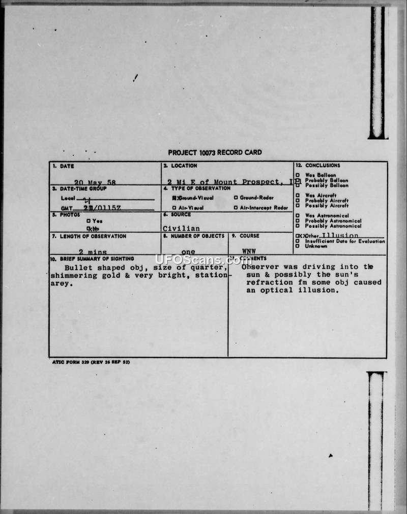A 1958 sighting of a 'bullet-shaped' object in Illinois was officially dismissed by the Air Force as an optical illusion caused by sun refraction. Later correspondence from a planetarium director provided a more detailed, saucer-like description, which was similarly dismissed by astronomer Donald Menzel.