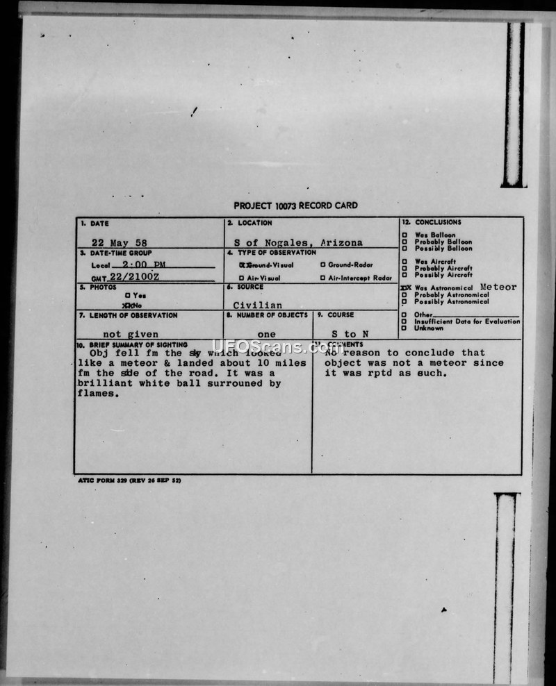 A civilian reported a brilliant white, flame-surrounded object falling from the sky near Nogales, Arizona, on May 22, 1958. Military authorities categorized the event as a meteor, though they noted the report lacked sufficient detail for a definitive conclusion.