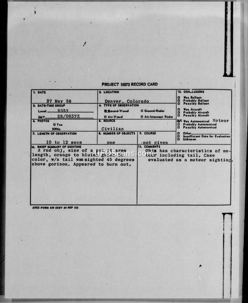 Project 10073 Record Card — Denver, Colorado, 27 May 1958