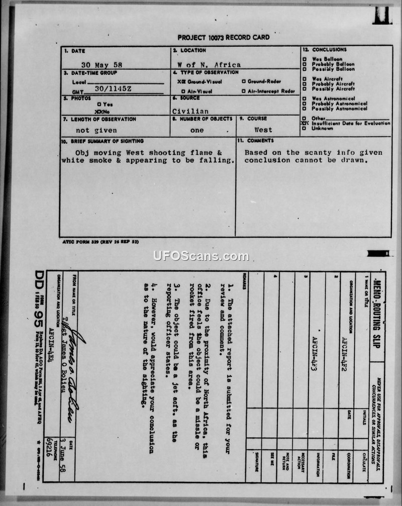 This document is a collection of records, including a Project 10073 record card, regarding a sighting on 30 May 1958, approximately 765 miles west of North Africa. A vessel reported an object moving due west, emitting flame and white smoke, and appearing to be falling. The report notes that there were no indications of aircraft distress in the area, and suggests the possibility of 'jet torching.' Subsequent internal routing slips from the Air Force intelligence division (AFCIN) indicate that the information provided was too scanty to draw a definitive conclusion, with one evaluator noting that Soviet aircraft or missile activity was considered the least likely explanation. The document also contains extensive supplementary material, including transcripts of interviews conducted by Gray Barker regarding a separate sighting in Holly River, West Virginia, and technical data regarding the orbital path of the Soviet satellite Sputnik III, which was being tracked during the same period. The inclusion of these materials suggests a broader context of monitoring aerial phenomena and satellite activity during the spring of 1958.