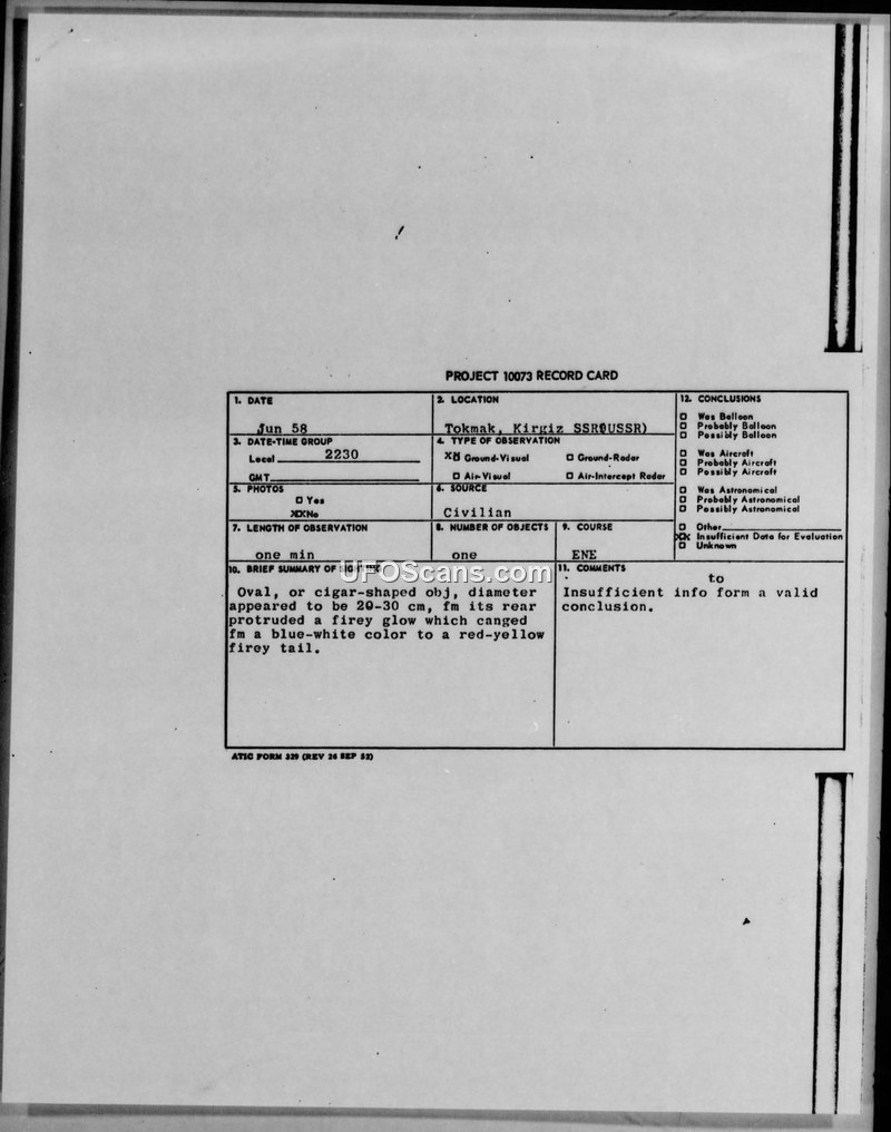 A 1958 sighting report from Tokmak, USSR, describes a silent, cigar-shaped object with a glowing tail. The US Air Force concluded there was insufficient data to identify the object.