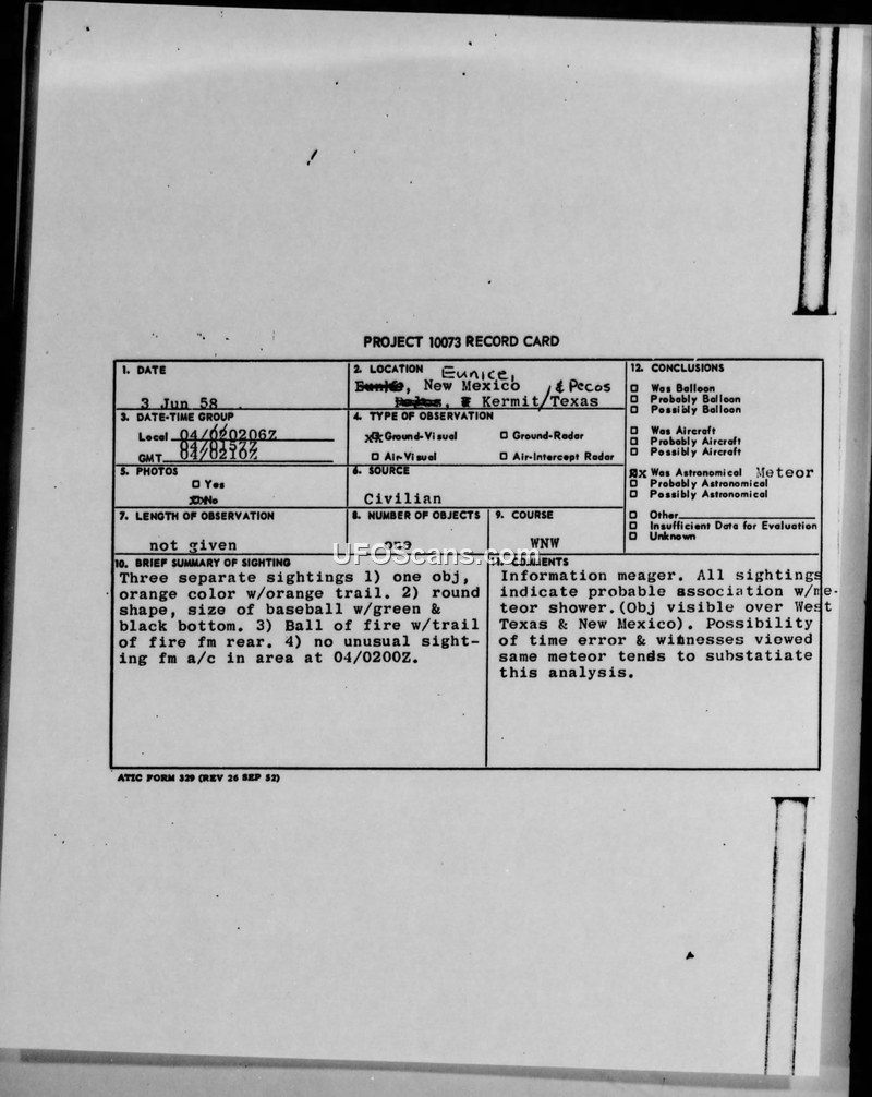 This document consists of a Project 10073 record card and associated military communications regarding a series of UFO sightings reported on June 4, 1958, in the vicinity of Eunice, New Mexico, and Pecos and Kermit, Texas. The reports describe a single object, characterized as round and baseball-sized, displaying orange, green, and black colors with an orange trail resembling jet exhaust. Witnesses, including a civilian with an interest in astronomy, reported the object moving at a very high altitude in a west-northwest direction. Military intelligence, specifically Major Corbin D. Stevens of the 6th Bomb Wing at Walker Air Force Base, compiled the reports. The official conclusion reached by the investigating authorities was that the sightings were likely associated with a meteor shower. The report notes that the information provided was meager and suggests that discrepancies in witness accounts and timing could be attributed to the observation of a single meteor event. The documentation includes weather data for the region and references to standard Air Force regulations regarding UFO reporting procedures. The file was originally classified as Confidential but was later declassified.