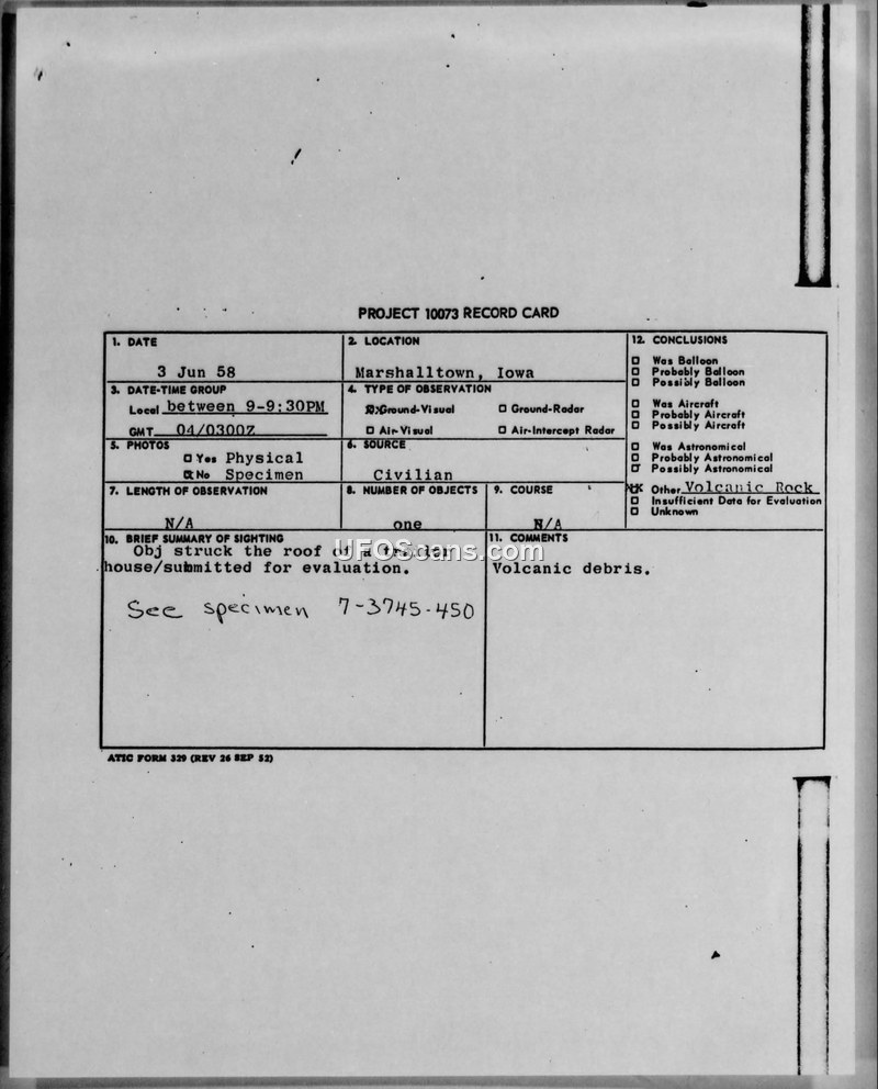 This document details a sighting and recovery incident occurring on June 3, 1958, in Marshalltown, Iowa. A resident reported that an unknown object struck the roof of their trailer house between 9:00 PM and 9:30 PM, producing a sound described as a loud rifle report. Upon investigation, the resident discovered multiple fragments and collected the largest piece. Following a radio broadcast from station KFJB regarding Soviet satellite information, the resident and his wife suspected the object might be a meteor fragment and submitted it to the local Ground Observer Squadron for investigation. The specimen was forwarded through military channels, including the 4715th Ground Observer Squadron and the 20th Air Division, to the Air Technical Intelligence Center at Wright-Patterson Air Force Base. Military personnel, specifically M/Sgt Brown of the 328th CAMRON, performed a radioactivity check on the object and found it to be completely non-radioactive. The final assessment recorded on the Project 10073 record card identified the object as volcanic rock or volcanic debris. The physical specimen was subsequently cataloged and stored in an artifact room.