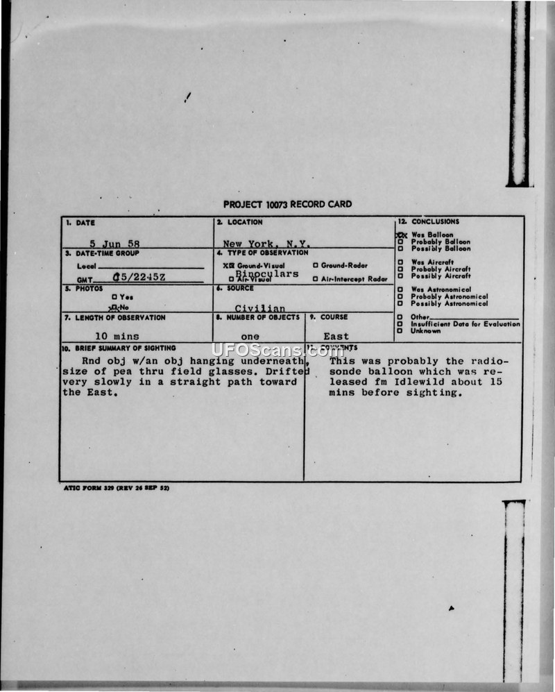 A sighting of a round object with an object hanging underneath on June 5, 1958, was investigated by ATIC. The object was officially concluded to be a radiosonde balloon released from Idlewild airport.