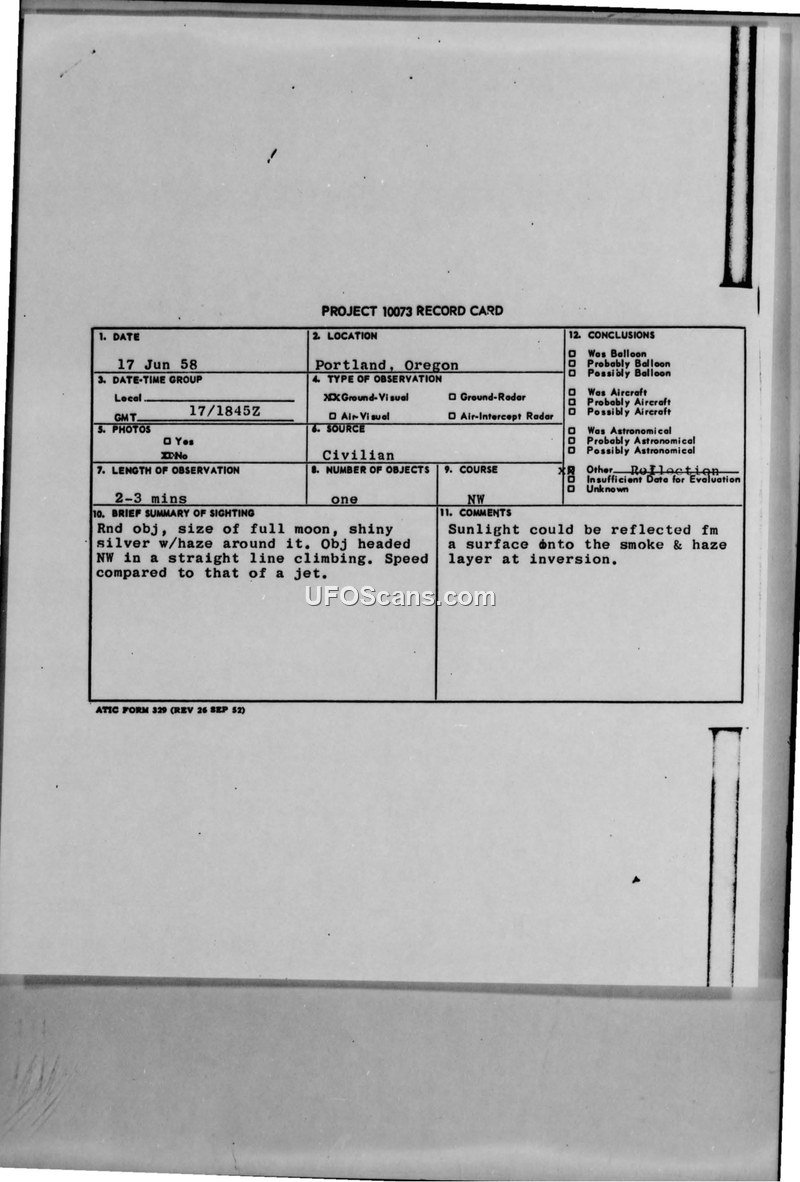 Project 10073 Record Card — Portland, Oregon, 17 June 1958