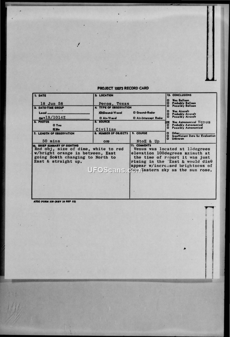 Project 10073 Record Card — Pecos, Texas, 18 June 1958