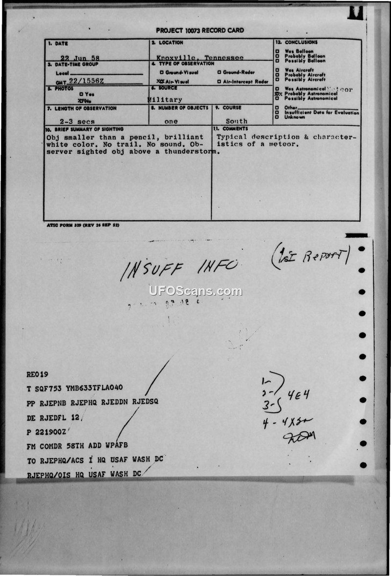 Unidentified Flying Object Sighting Report — Knoxville, Tennessee, 22 June 1958
