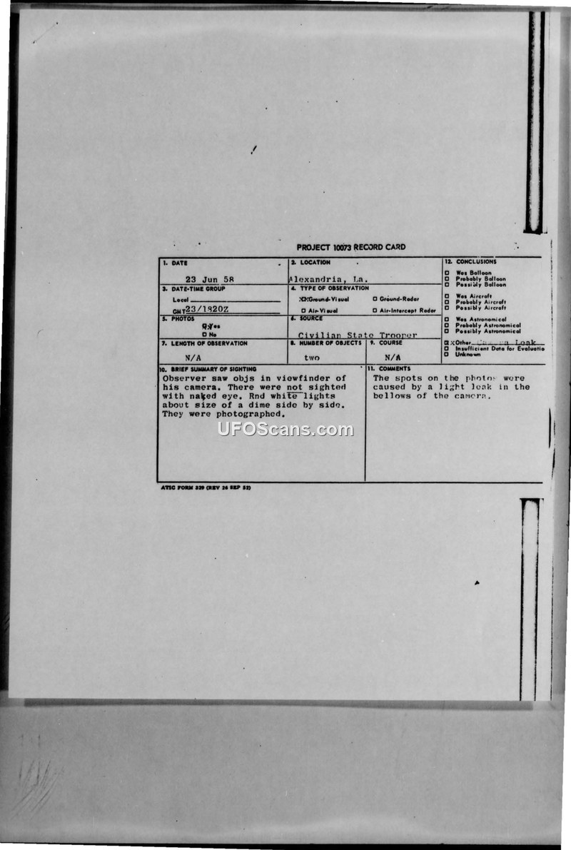 Project 10073 Record Card — Alexandria, Louisiana, 23 June 1958