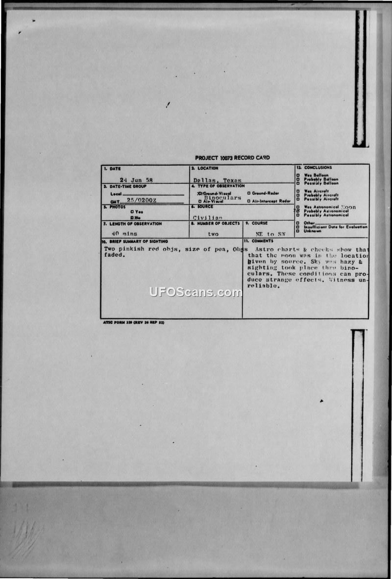Project 10073 Record Card - Dallas, Texas - 24 June 1958
