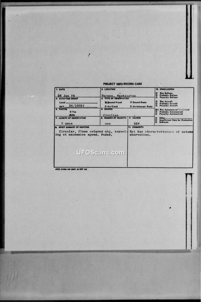 This document archive contains a collection of reports, correspondence, and technical information sheets regarding UFO sightings reported in Belfast, Maine, during the summer of 1958. The primary record card, dated 26 June 1958, documents a sighting of a circular, flame-colored object traveling at excessive speed in a south-southwesterly direction. The observation lasted approximately five seconds. Subsequent documentation includes multiple technical information sheets filled out by witnesses, including a State Police Sergeant, describing various sightings of lights in the sky that exhibited rapid, erratic movements, color changes, and appearances that suggested they were 'jumping stars' or atmospheric phenomena. Witnesses frequently noted the presence of fog or haze during these observations. The archive also contains significant correspondence from 1965 between the witnesses, Senator Margaret Chase Smith, and the U.S. Air Force. The witnesses sought the return of photographic negatives they had submitted to the Air Force for analysis in 1958. The Air Force, through the Foreign Technology Division and the Office of Information, responded that the negatives had been analyzed by experts, including Dr. W. F. Chambers of the University of Vermont and civilian consultant Dr. Allen Hynek. The official conclusion provided by the Air Force was that the object captured in the negatives was the star Arcturus. The documents reflect the administrative process of handling civilian UFO reports, the involvement of high-level military intelligence, and the eventual resolution of the specific photographic evidence as an astronomical identification.