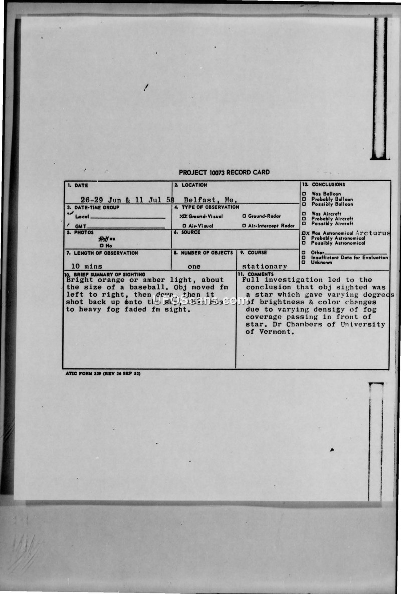 A series of UFO sightings in Belfast, Maine, in 1958 were investigated by the Air Force and determined to be the star Arcturus. The perceived erratic movements and color changes were attributed to atmospheric fog and observer error.