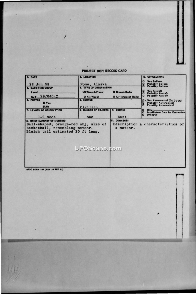 A June 1958 sighting of an orange-red, ball-shaped object in Nome, Alaska, was investigated by the 11th Air Division. The military concluded the object was a meteor, dismissing reports of it hitting the water as a misidentified natural wave.