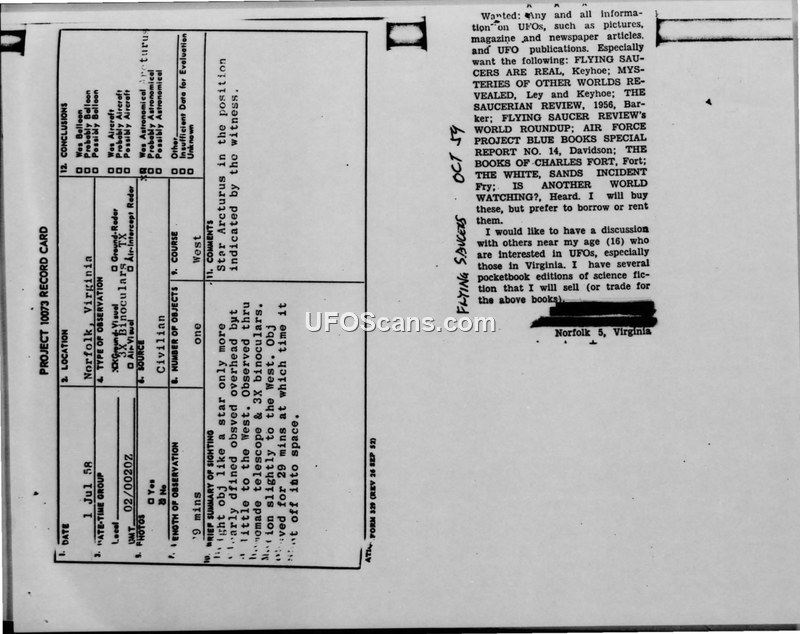 This document contains a Project 10073 record card and associated routing memo regarding a UFO sighting reported in Norfolk, Virginia, on July 1, 1958. The witness, a 16-year-old, reported observing an object at approximately 7:20 P.M. E.S.T. while working in a garden. The witness described the object as appearing like a bright star that was more clearly defined, which moved slowly to the west. The witness used a homemade telescope and 3-power binoculars to observe the object for 29 minutes. Through the telescope, the object appeared perfectly round with a bright metallic glint in the center and dark outer edges. The object eventually 'blurted' out of view at 7:49 P.M. The witness noted that the sky was clear and that they had contacted the weather bureau, who confirmed no weather balloons were in the area. The witness also expressed interest in UFO literature, requesting information on various books and publications. The Air Technical Intelligence Center (AFCIN-4E4) evaluated the report and concluded that the object was likely the star Arcturus, which was in the precise location reported at that time. The memo from Capt. George T. Gregory notes that viewing stars or planets through hand-held telescopes often produces unusual appearances and that no radar or other reports of unusual activity were received in the area. The report was filed as part of the Air Force's continuous analysis of UFO phenomena.