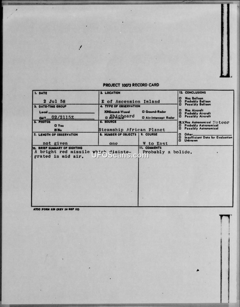 The crew of the SS African Planet reported a bright red missile that disintegrated in mid-air on July 2, 1958. Investigators concluded the object was likely a bolide associated with the PERSEID meteor shower.