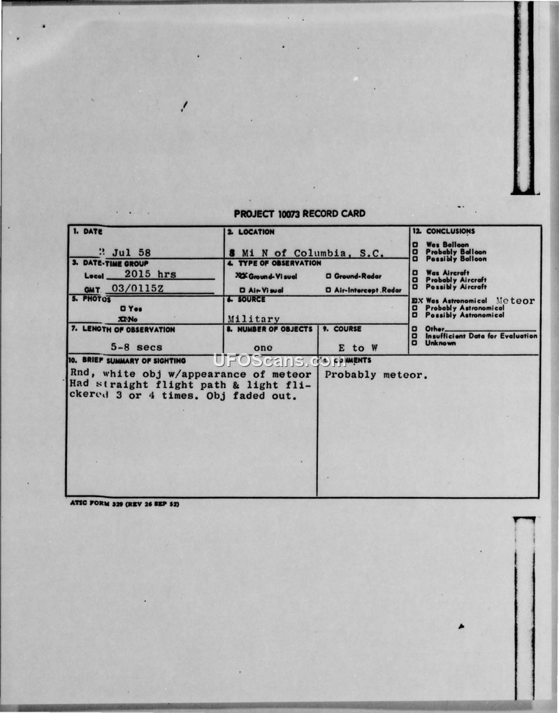 A military witness reported a round, white object resembling a meteor on July 2, 1958, near Columbia, South Carolina. The Air Force concluded the object was likely a meteor.