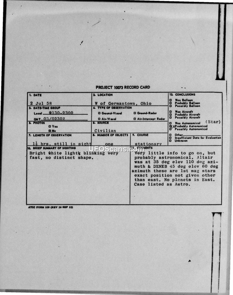 Project 10073 Record Card — Germantown, Ohio, 2 July 1958