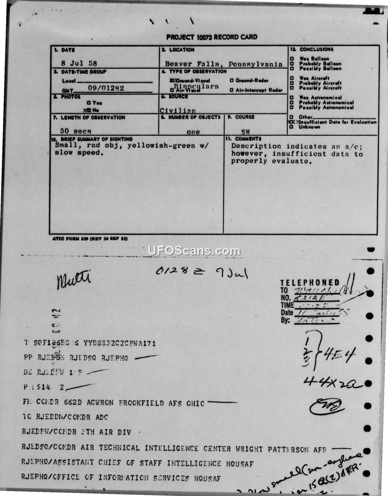 A sighting of a small, round, yellowish-green object in Beaver Falls, PA, on July 8, 1958, was investigated by the Air Force. The report concluded that there was insufficient data to identify the object, despite its flight characteristics suggesting an aircraft.