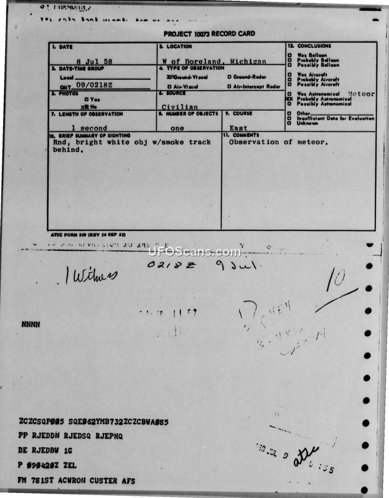 This document contains two Project 10073 record cards and associated military communications regarding UFO sightings reported by a civilian hydro operator near Hardy Dam, Michigan, in July 1958. The first sighting occurred on 8 July 1958, where a round, bright white object with a smoke track was observed for one second. The second sighting occurred on 29 July 1958, where a round, white object the size of a pea at arm's length was observed for ten seconds before disintegrating. Both reports were investigated by the 781st ACWRON at Custer AFS and the Air Technical Intelligence Center. The official conclusion for both incidents was that the objects were meteors. Military personnel, including Senior Director Lt. John Meyer, provided context regarding radar activity in the area and the possibility of light reflections from high-altitude aircraft or weather balloons. The 29 July sighting was further identified as a bolide associated with the Delta Aquarid meteor shower, which was active at the time. The reports include weather data, observer information, and technical comments from the Air Technical Intelligence Center.
