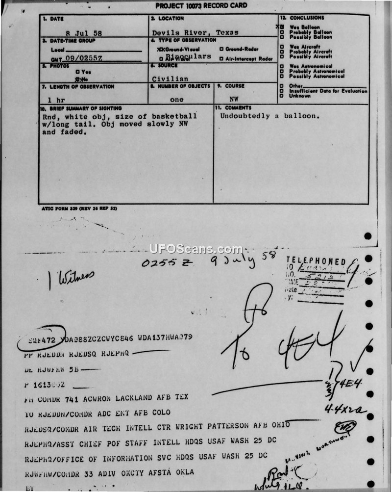 A civilian reported a round, white object with a tail near Devils River, Texas, on July 8, 1958. Military investigators concluded the object was a balloon based on wind data and witness observations.