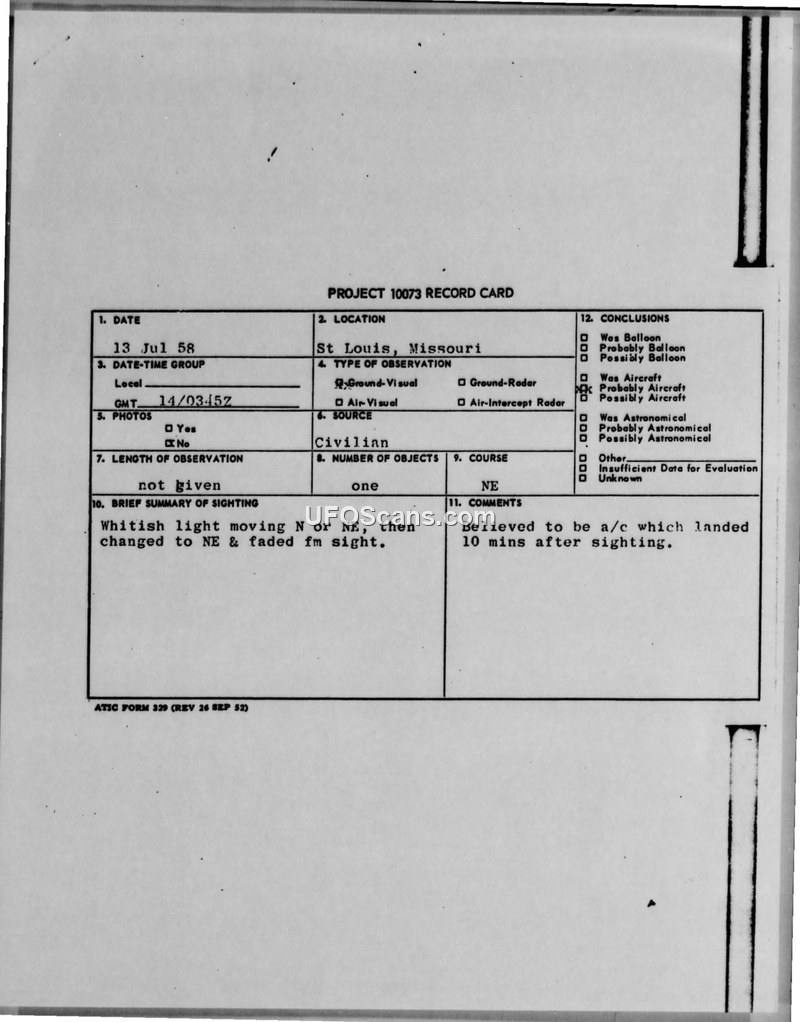 PROJECT 10073 RECORD CARD - 13 Jul 58 - St Louis, Missouri