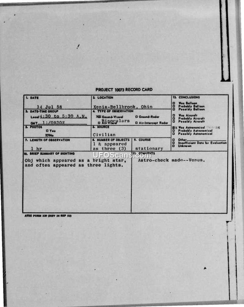This document consists of a Project 10073 record card and a follow-up memorandum regarding a UFO sighting reported in Xenia, Ohio, on July 14, 1958. A civilian witness reported observing a stationary object between 4:30 A.M. and 5:30 A.M. The witness described the object as appearing like a bright star, which frequently manifested as three distinct lights. Following a telephone interview conducted by Captain George T. Gregory of the USAF on July 15, 1958, additional details were gathered. The witness noted that the object was in the general vicinity of the Northeast and that its visibility was affected by cloud cover during the latter half of the observation. Captain Gregory investigated the report by checking local radar and flight logs, finding no unusual activity from local radar or B-47 aircraft. An astronomical check was performed, which confirmed that the planet Venus was rising in the Northeast at the time of the sighting. The investigator concluded that the reported object was Venus, noting that weather conditions likely caused the object to appear highly magnified to the observer.