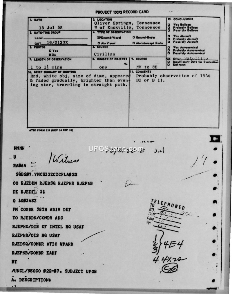 A July 1958 sighting report from Tennessee describes a round, white object observed by an AEC employee. Military investigators concluded the object was likely a balloon or astronomical phenomenon.