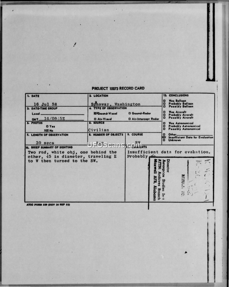 Project 10073 Record Card — Spanaway, Washington, 16 July 1958