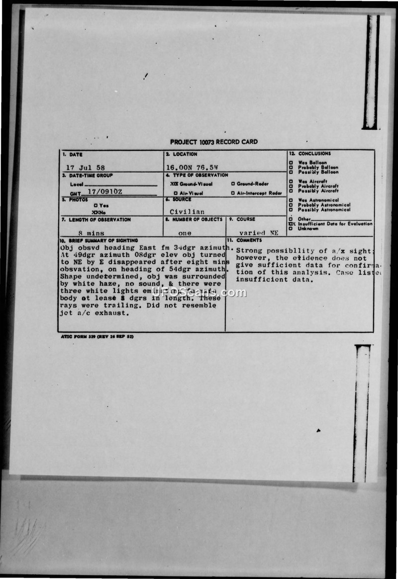 Project 10073 Record Card — 17 July 1958 Sighting