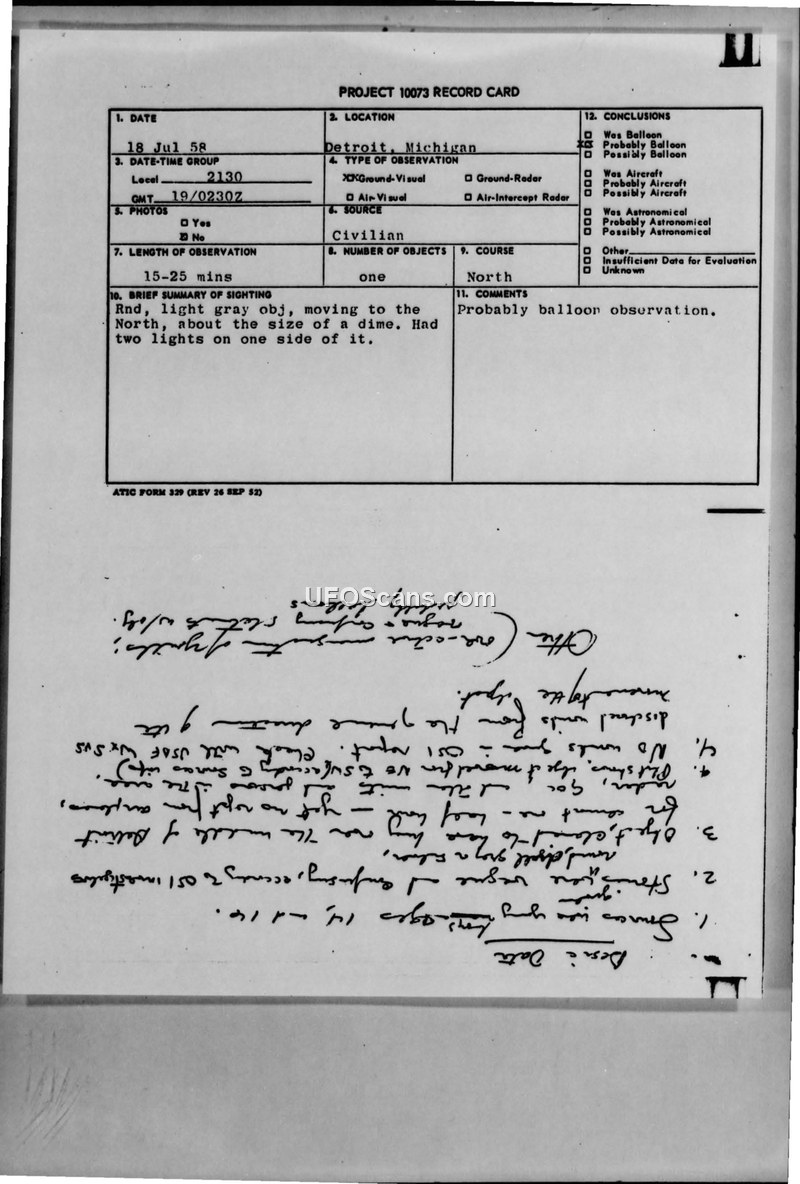 Three brothers in Detroit reported a round, light-gray object with two lights on 18 July 1958. The Air Force investigation concluded the object was likely a balloon.