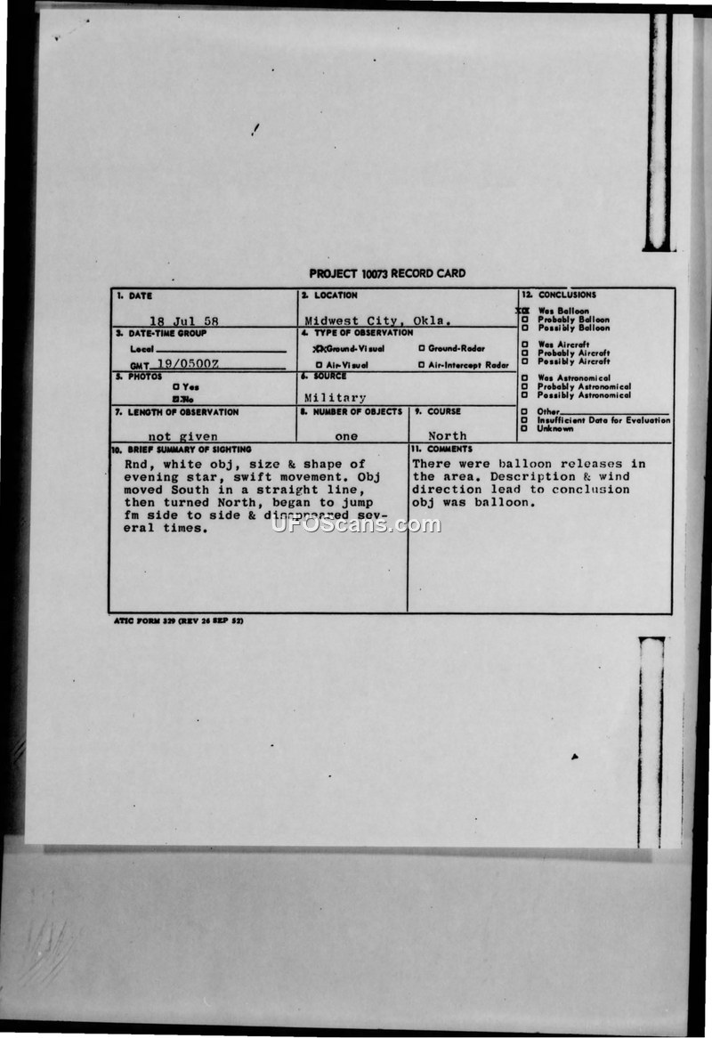 A sighting of a round, white object in Midwest City, Oklahoma, on July 18, 1958, was investigated by the 33rd Air Division. The object was officially identified as a weather balloon based on local release schedules and wind data.