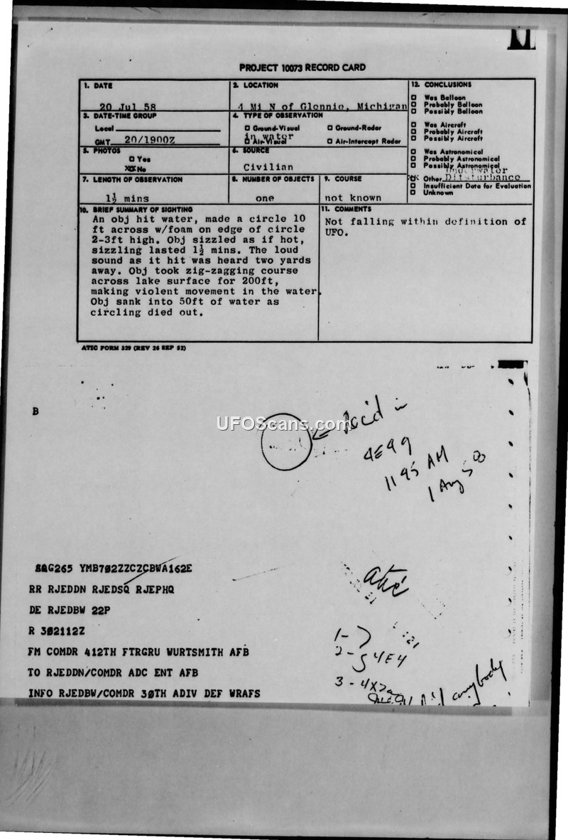 This document details a sighting report from 20 July 1958, involving an unidentified object that impacted a lake four miles north of Glennie, Michigan. The report, processed under Project 10073, describes an object that hit the water, creating a ten-foot-wide circle with foam reaching two to three feet in height. Witnesses, including a resort owner and a vacationer, reported a loud sound upon impact, followed by a sizzling noise that lasted for approximately one and a half minutes. The object reportedly moved in a zig-zagging fashion across the lake surface for 200 feet before sinking into 50 feet of water. The investigation, conducted by 2nd Lt John B. McKinnon of the 445th Finceptron, concluded that the object did not fall within the definition of a UFO because it was never observed in the air. Intelligence assessments suggested the phenomenon might have been caused by an underwater disturbance, a semi-dud bomb, or perhaps a weather balloon remnant from the Green Bay or Milwaukee areas. The report notes that the depth of the lake prevented any physical recovery of the object. The Air Technical Intelligence Center (ATIC) requested further investigation into the incident, specifically suggesting interviews with local pilots and air crews, and potential dredging of the lake, provided the object was determined to be a valid UFO. However, the final Air Intelligence Information Report ultimately classified the incident as not a UFO, attributing the event to an unknown underwater disturbance.
