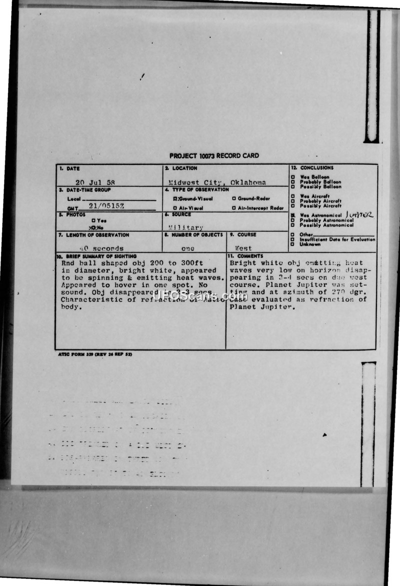 A 1958 sighting of a large, bright object in Midwest City, Oklahoma, was officially attributed to the refraction of the planet Jupiter. The report includes internal military correspondence questioning the reliability of the witness and noting the concurrent release of a weather balloon.
