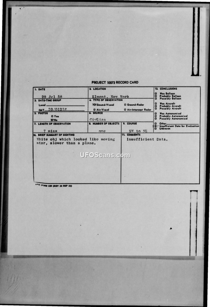 A 1958 sighting report from Elmont, New York, involving a white, star-like object observed for seven minutes. The military investigation concluded there was insufficient data to identify the object.