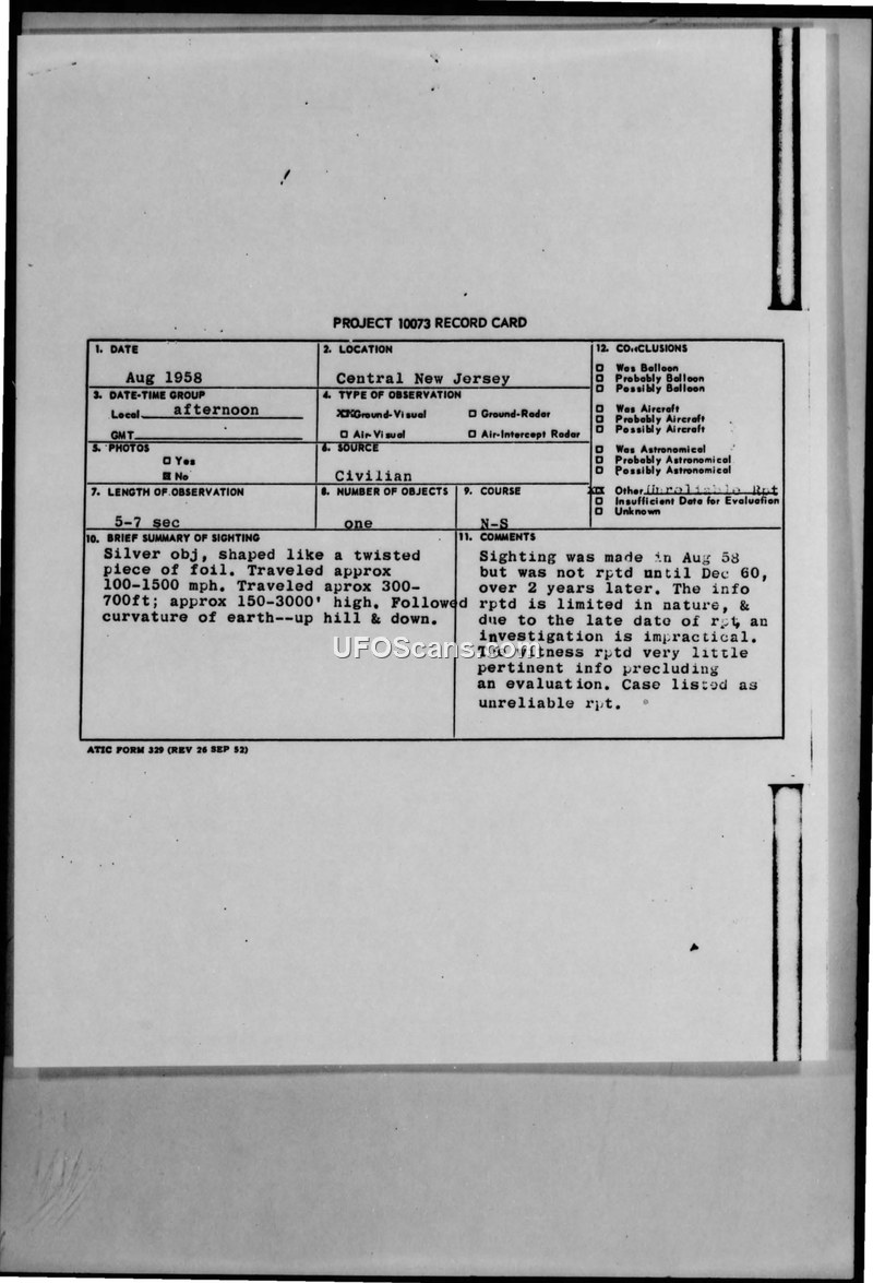 This document is a Project 10073 record card detailing a sighting of an unidentified flying object in Central New Jersey, specifically near Bound Brook, in August 1958. The witness described the object as a silver, twisted piece of foil that appeared to follow the curvature of the earth, moving up and down hills. The object was estimated to be traveling at speeds between 100 and 1500 mph at an altitude ranging from 150 to 3000 feet. The duration of the observation was reported as five to seven seconds. The witness noted an unusual amount of air activity in the area at the time, including two commercial airliners, three Air Force or Navy jets, and one civilian plane. The report includes sketches of the object's possible shapes, reinforcing the description of it resembling foil blowing in the wind. The official evaluation of the incident was severely hampered by the fact that the sighting was not reported until December 1960, more than two years after the event took place. Because of this significant delay and the lack of pertinent information provided by the witness, the Air Technical Intelligence Center (ATIC) determined that a proper investigation was impractical. Consequently, the case was officially closed and categorized as an unreliable report due to insufficient data for a meaningful evaluation.