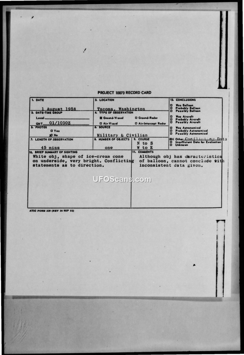 This document comprises a collection of records and correspondence regarding an Unidentified Aerial Phenomena (UAP) sighting that occurred on August 1, 1958, in Tacoma, Washington. The primary record is a Project 10073 card, which documents a 45-minute observation of a white, very bright object described as having an 'ice-cream cone' shape on its underside. The sighting involved multiple witnesses, including military personnel from the US Coast Guard, and was tracked via visual and ground radar. Reports regarding the object's flight path were conflicting, with some witnesses reporting movement from North to South, others from West to East, and some from Northeast to North-Northeast. The object was also reported as 'grapefruit-like' in appearance. Following the incident, the Air Technical Intelligence Center (ATIC) requested tracking data from the 1110th Balloon Activities Group to determine if the object could be identified as an upper-atmosphere balloon. The 1110th Balloon Activities Group responded that they had no record of any balloon or related activities in the Tacoma area on the date in question. Consequently, the official conclusion remained that while the object possessed characteristics of a balloon, the inconsistent data provided by witnesses made a definitive conclusion impossible. The file includes internal military communications, including a joint message form, detailing the request for information and the subsequent negative response from the balloon activities group, as well as handwritten notes from investigators expressing frustration with the long duration of the sighting and the lack of conclusive data.