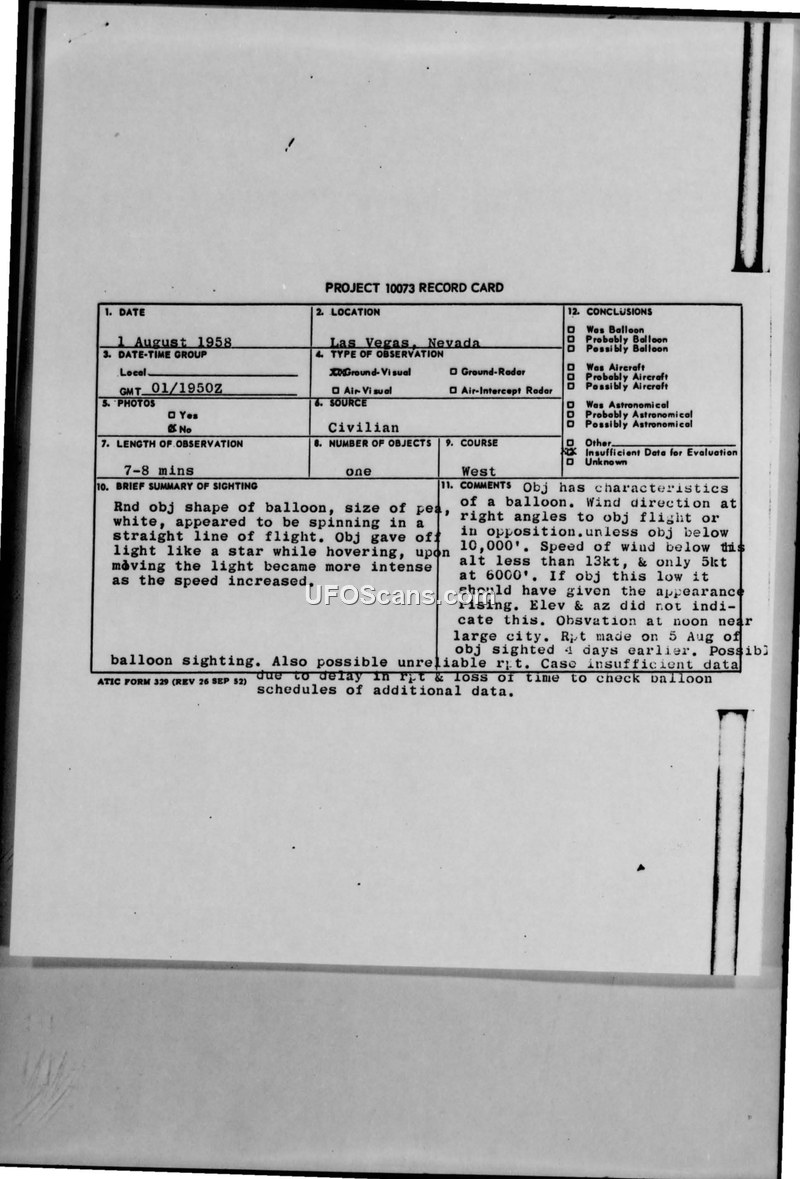 Project 10073 Record Card and Air Intelligence Information Report — Las Vegas, Nevada, 1 August 1958