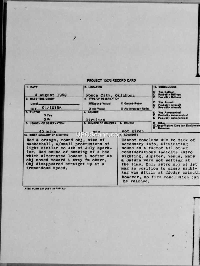 Unidentified Flying Object Reports — Ponca City, Oklahoma, August 1958